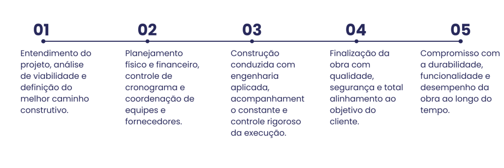 Cada obra é conduzida como um sistema bem definido. Antes de executar, analisamos o uso, o contexto e as exigências técnicas. O resultado são estruturas sólidas, funcionais e preparadas para o uso real.
